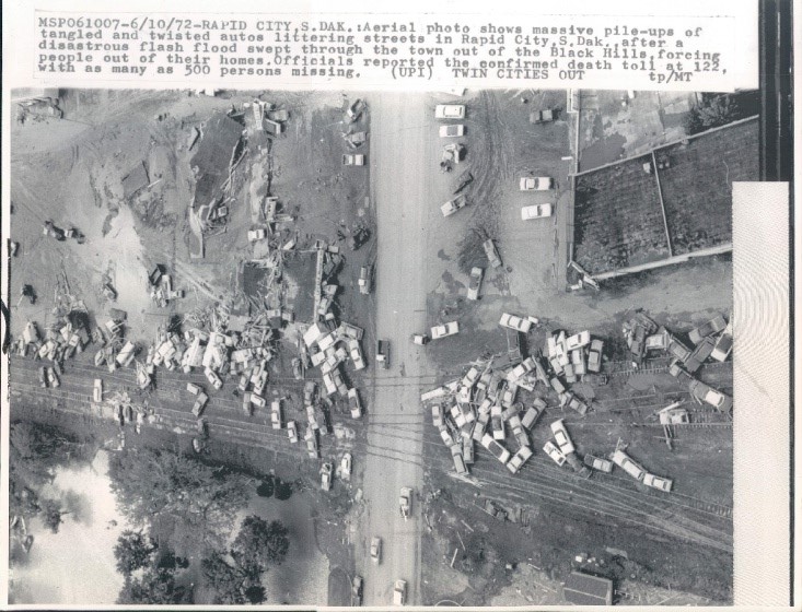 “Rapid City during the night of June 9-10, 1972 experienced one of the worst floods in the history of South Dakota. Fifteen inches of extreme rainfall over six hours sent Rapid Creek and other waterways overflowing… The Canyon Lake Dam became clogged with debris and failed, resulting in 238 deaths and 3,057 injuries… There were over 1,335 homes and 5,000 automobiles destroyed” (Wikipedia). They later were told a 12 foot high wall of water rushed down Rapid Creek through the center of Rapid City where the campground was located. Everyone in the campground was drowned”